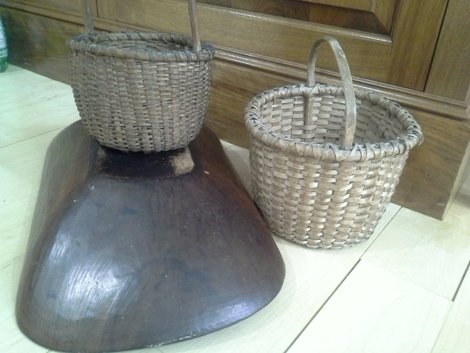 Two splint wood antique baskets and 18 1/2 inch wooden trencher with age appropriate usage